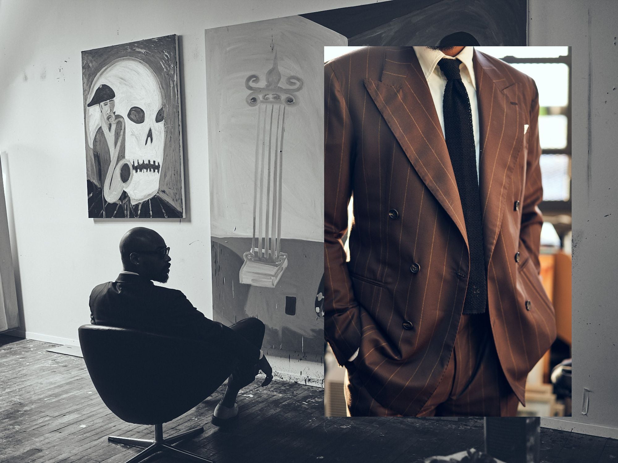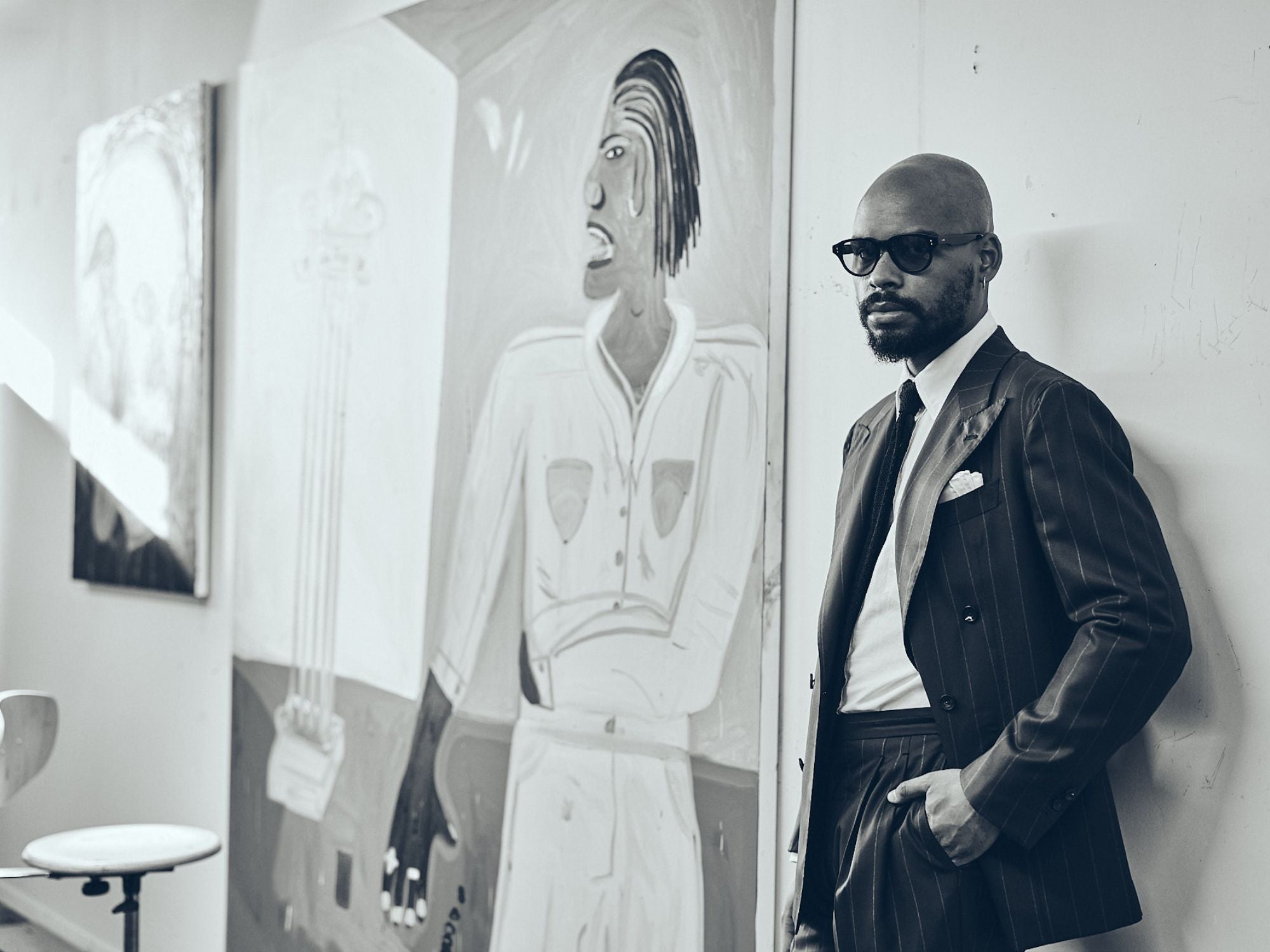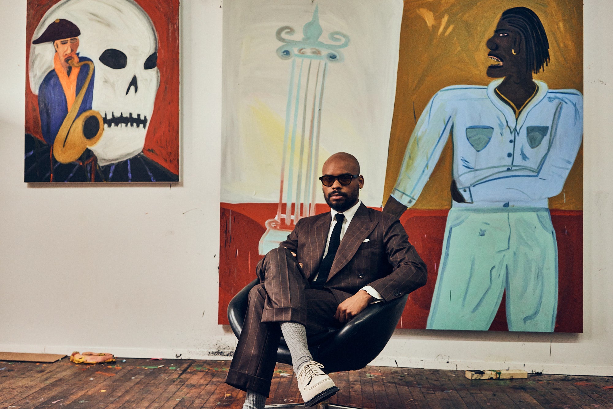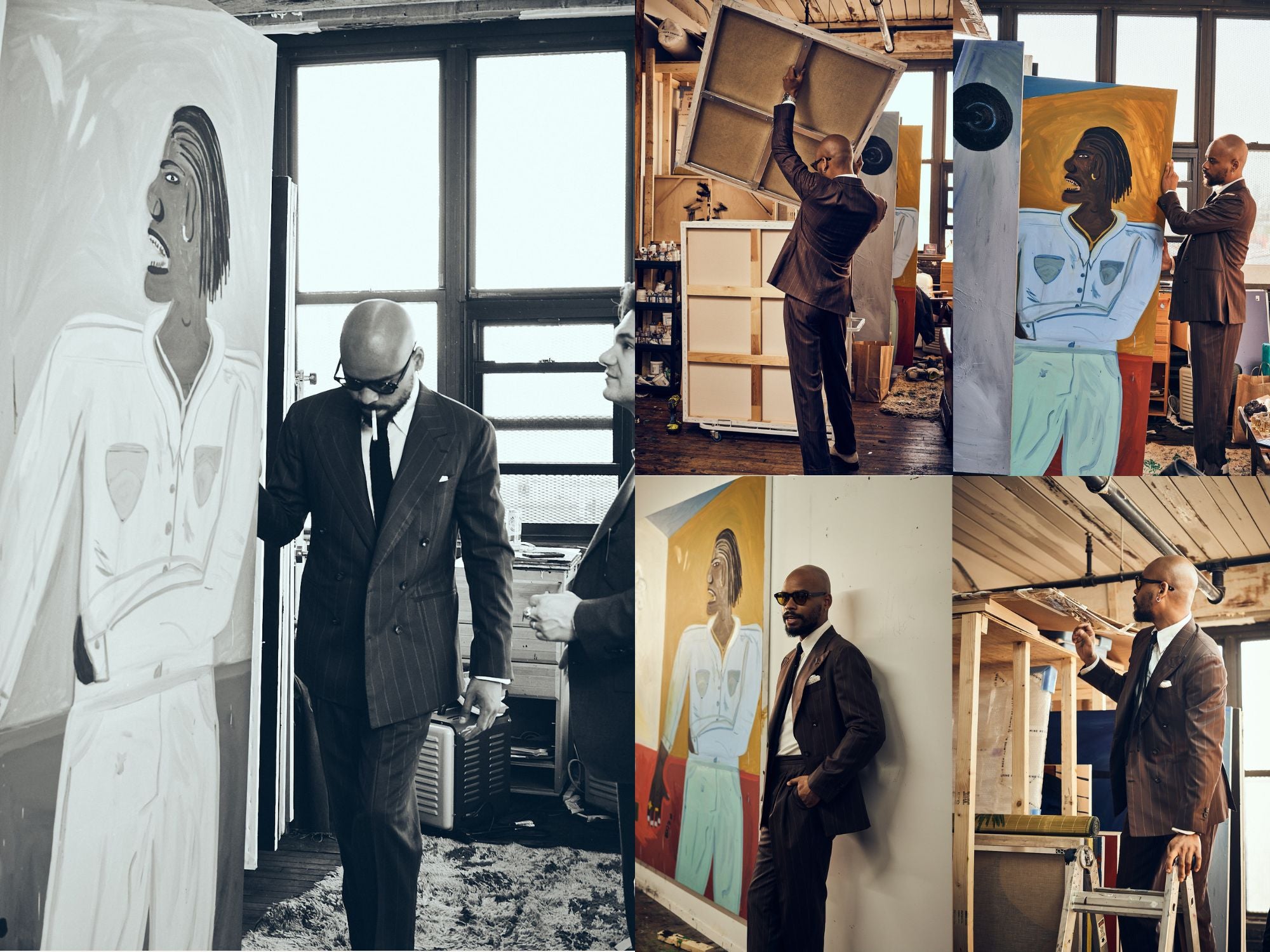 We recently toured the self-taught artist Marcus Jahmal’s Brooklyn studio- with friend and photographer Zeph Columbatto in tow. We took a peek around the place while Jahmal tried on his J. Mueser commission for a few final tweaks- ahead of his show at Almine Rech Gallery in Paris last April.