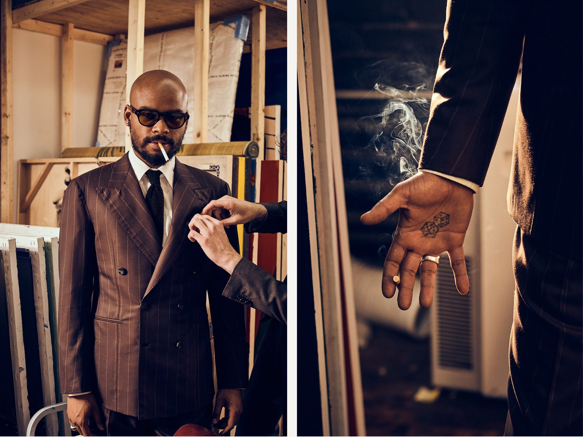 For his suit- we wanted something dramatic yet elegant. We started with a beautiful worsted cloth from Drago- a super 160’s wool in chocolate brown, with a subdued tan chalk stripe- something reminiscent of a suit you may have seen worn by the likes of Serge Gainsbourg. We opted for a six-by-two fastening and an extra-wide, 11-centimeter lapel. For a relaxed but formal look, we left out the shoulder pads, but finished the sleeve head with a tight rope and added jetted pockets. The trousers are cut full; with a high rise, side-adjusters, and a five centimeter cuff.