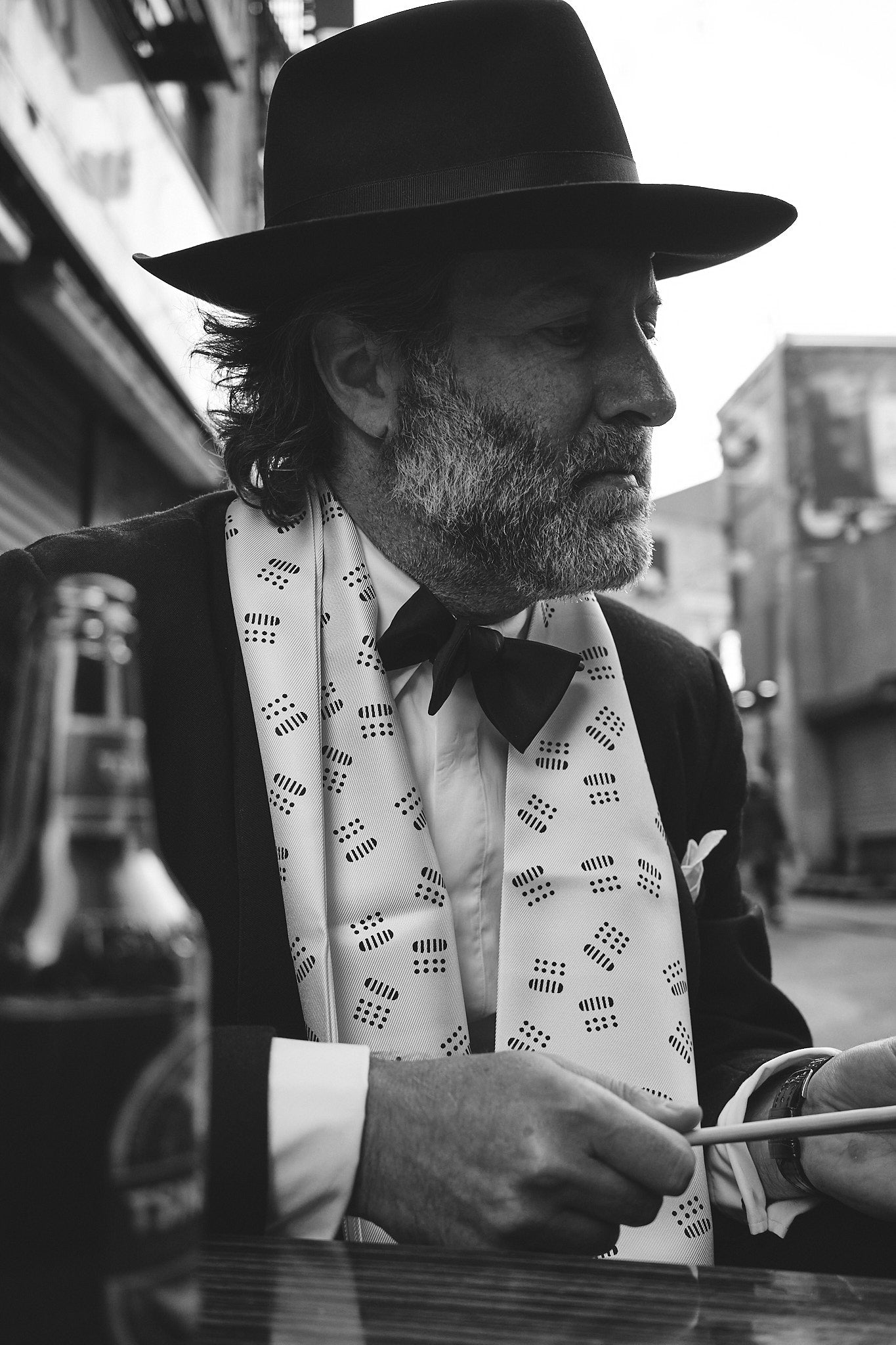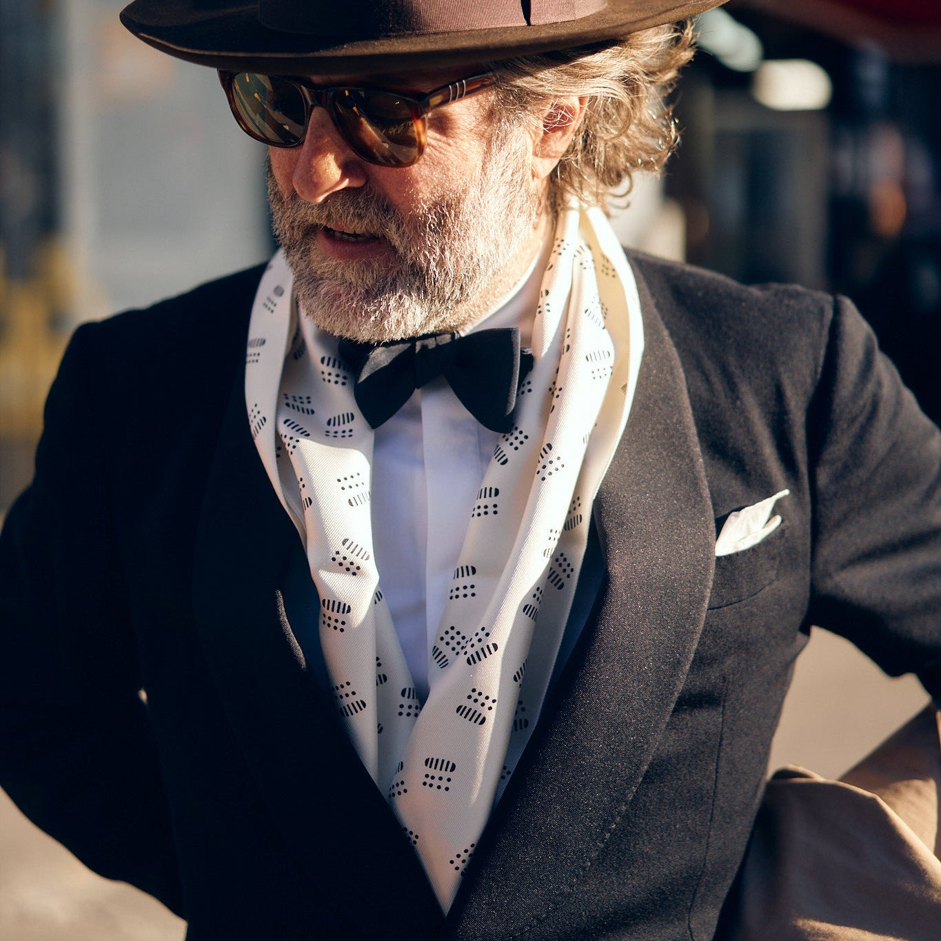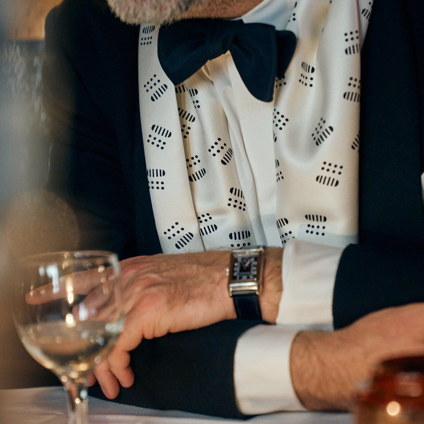 To go with it, we designed what I consider to be the perfect tuxedo shirt. The buttons are hidden covered by a placket, the collar is soft and unlined. And there are beautifully soft, unlined French cuffs (not something you find very often). It’s a subtle, discreet shirt that I think every man can own. We also made a dress scarf with a kind of Art Deco pattern that really brings everything together, made at Adamley, one of the last silk printers in England.