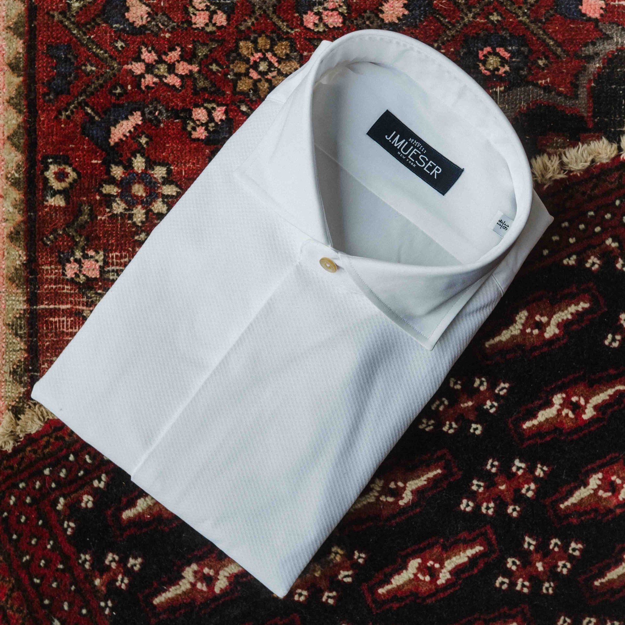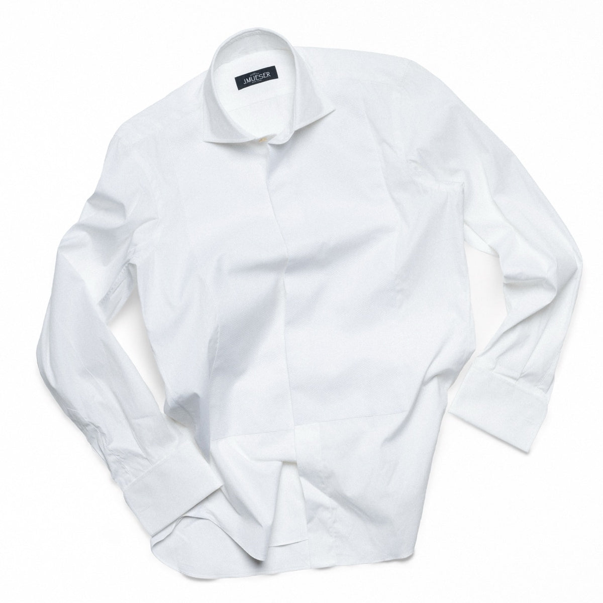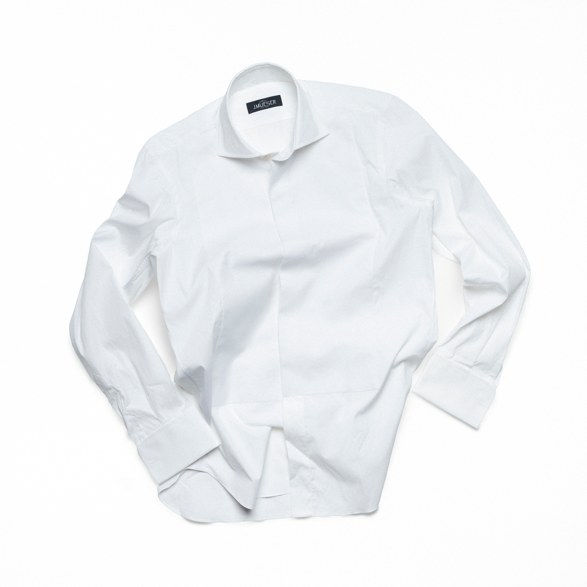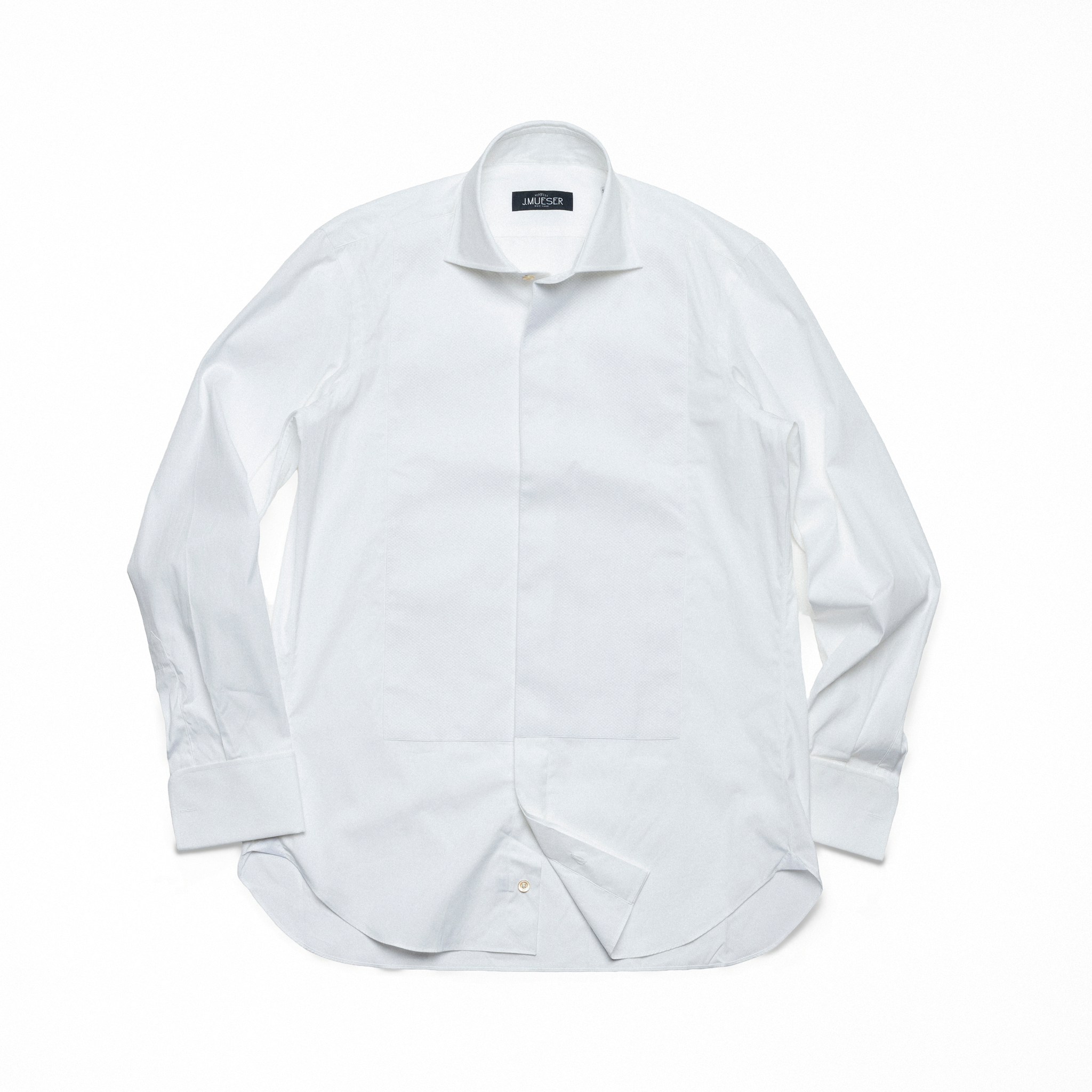 Superfine poplin body, piqué cotton bib, and a covered placket with no studs required. Our tuxedo shirt features french cuffs and a simple spread collar- our most dressed-up offering, and probably our most understated.