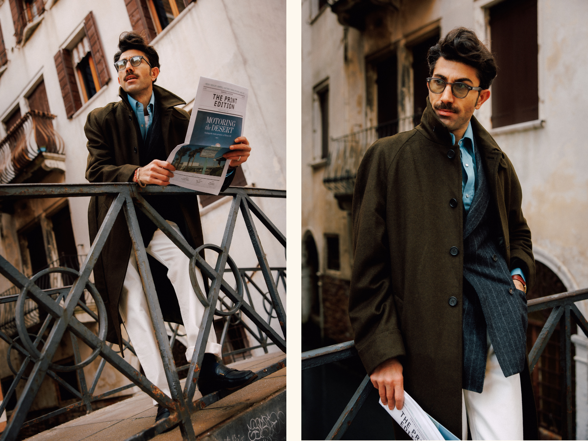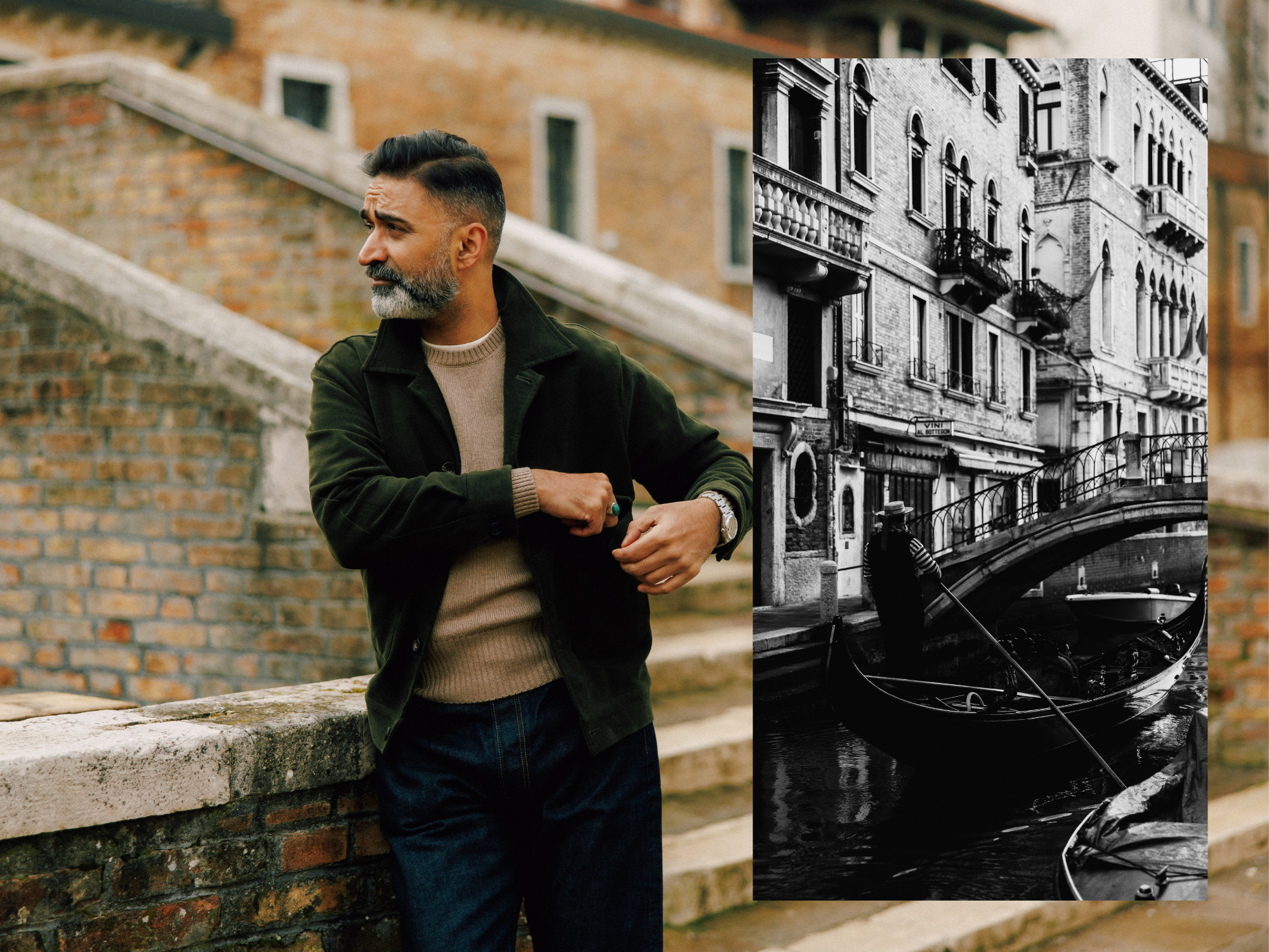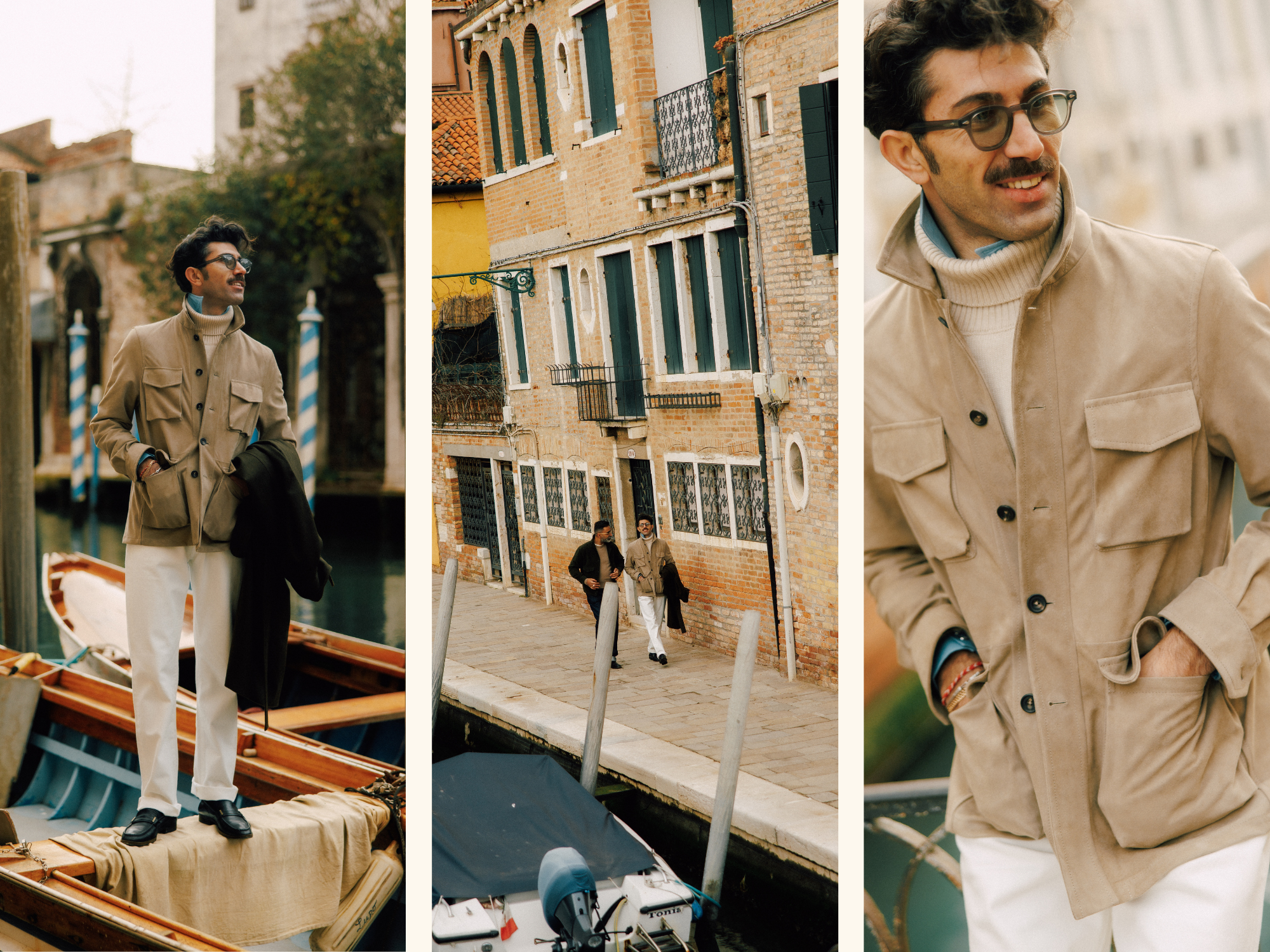 While spending a few days relaxing in a nearly-deserted Venice at the start of January, we thought it would an opportune time to showcase a few of our favorite products of the season on our friends Manish and Ata. Think blanket-like overcoats, not-so traditional chalk stripes in wool/cashmere blends, and easy-wearing Italian suede layers. All of this packed into a rugged Ghurka duffle, perfect for a jaunt next to the canal- a stop off for a quick americano and a view of the sun as it slides down over the water.