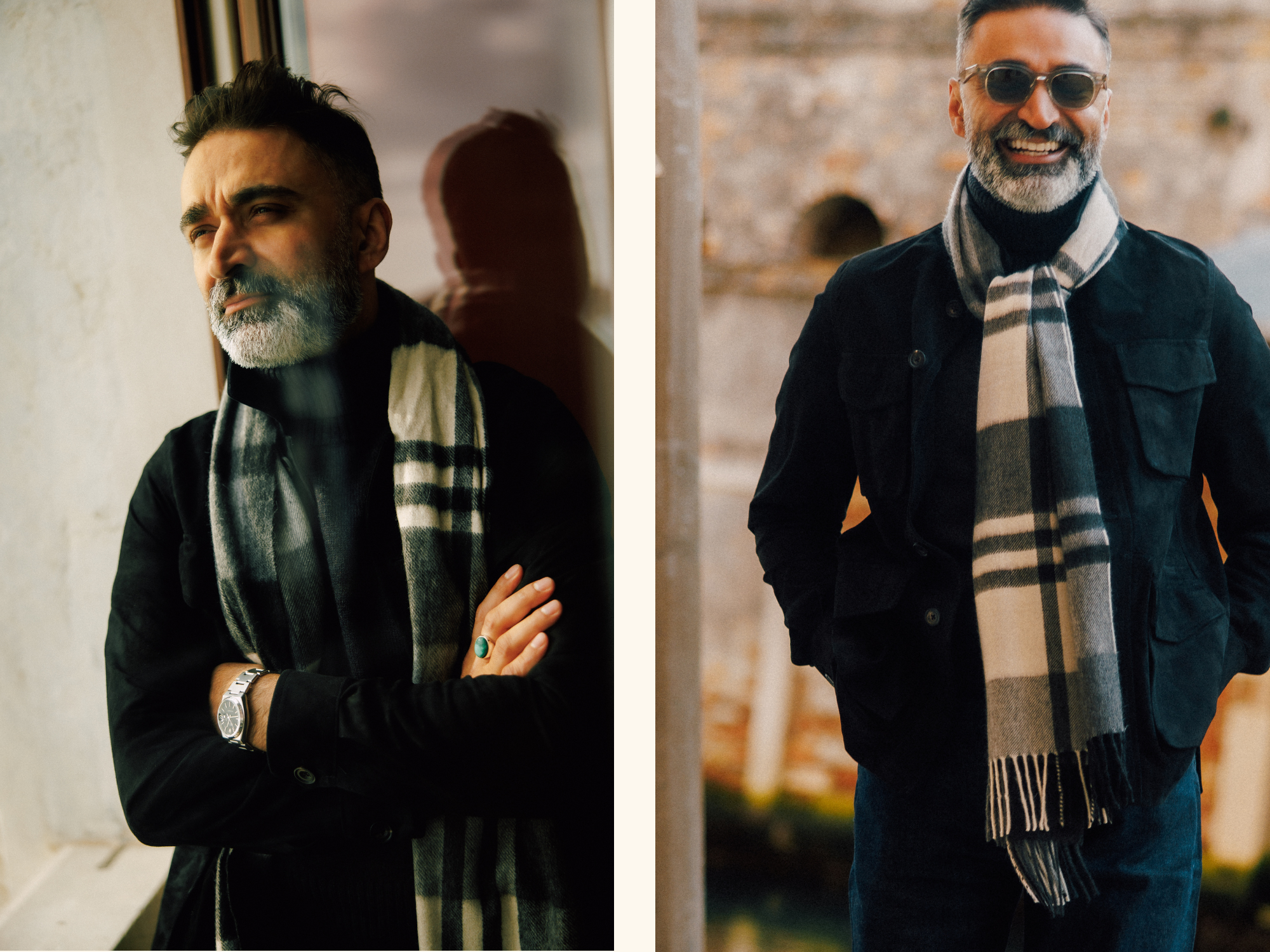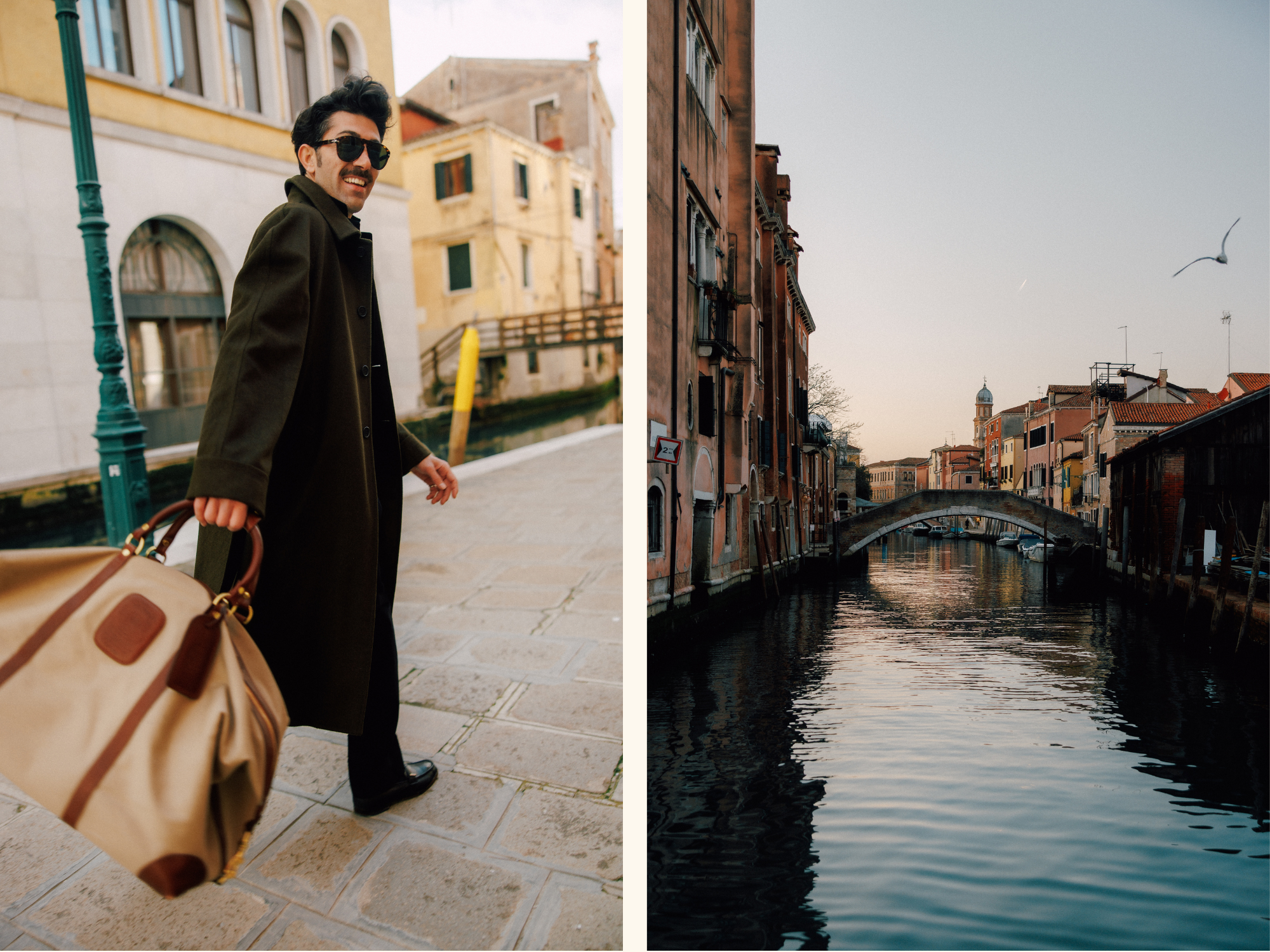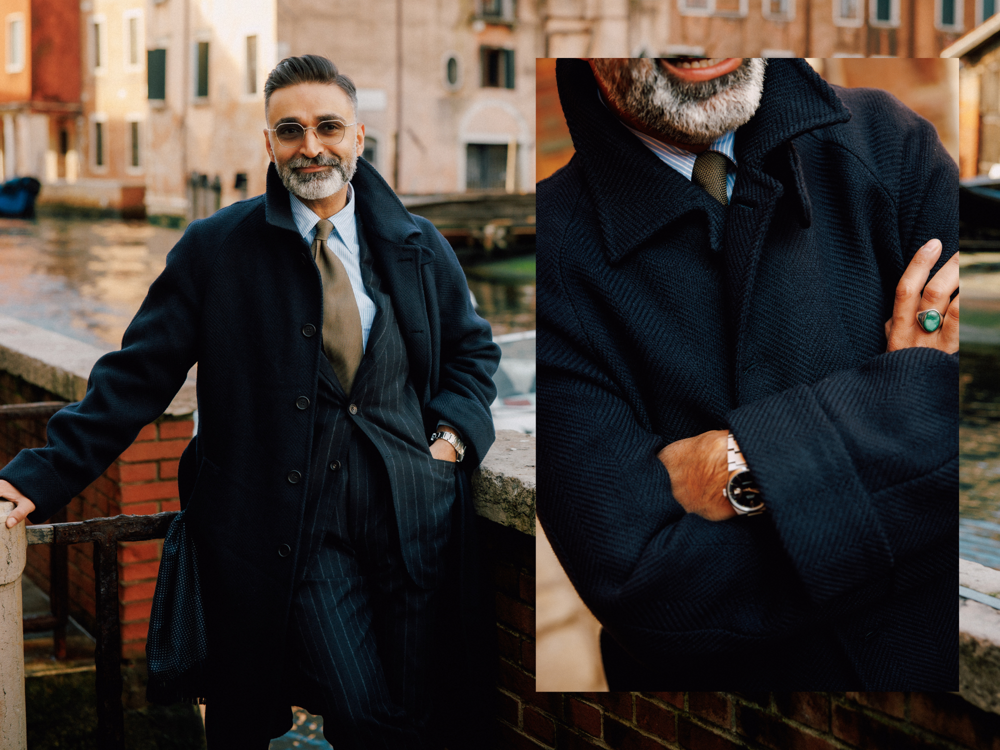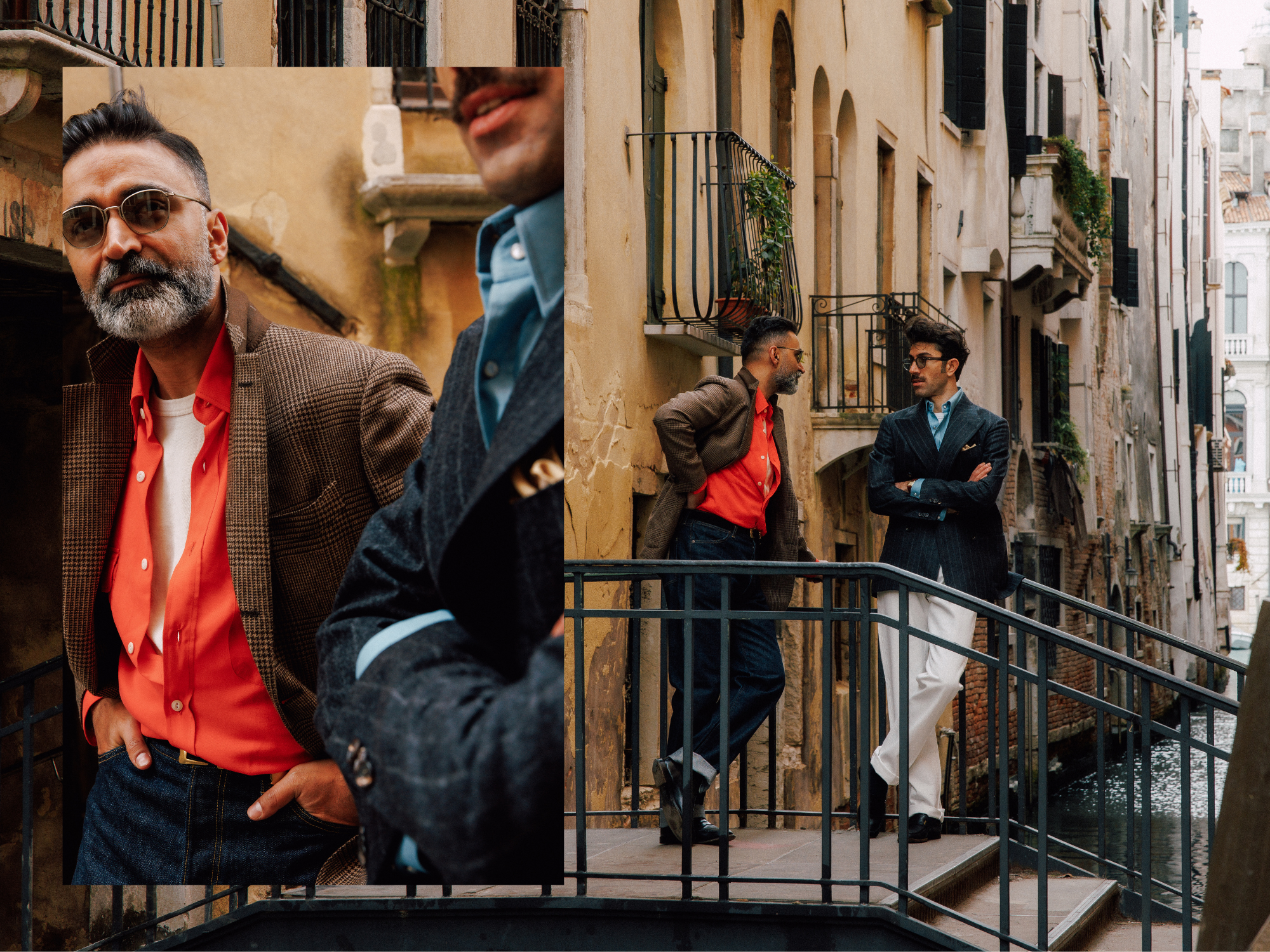 While spending a few days relaxing in a nearly-deserted Venice at the start of January, we thought it would an opportune time to showcase a few of our favorite products of the season on our friends Manish and Ata. Think blanket-like overcoats, not-so traditional chalk stripes in wool/cashmere blends, and easy-wearing Italian suede layers. All of this packed into a rugged Ghurka duffle, perfect for a jaunt next to the canal- a stop off for a quick americano and a view of the sun as it slides down over the water.