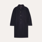 Our Belted Balmacaan features a raglan sleeve, wrap belt, long back vent, detachable throat latch, 5 button front, cocktail cuffs, and slanted welt pockets. Cut from a blanket-like 23oz navy herringbone wool, this an easy addition for the coldest days of Winter.