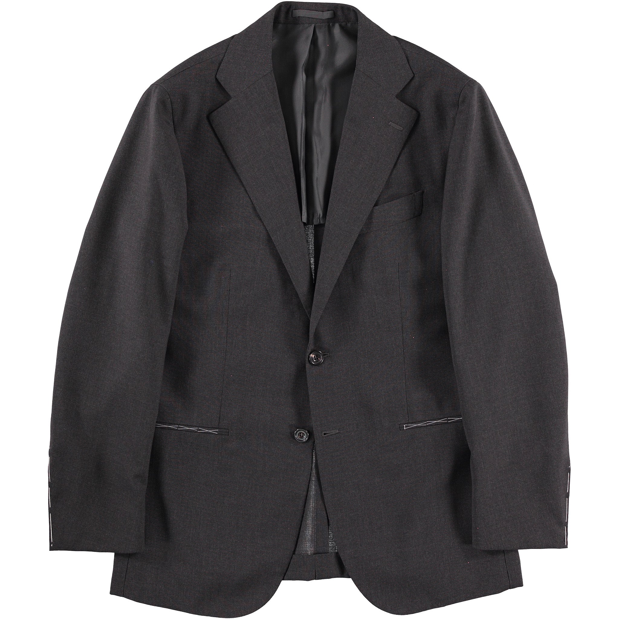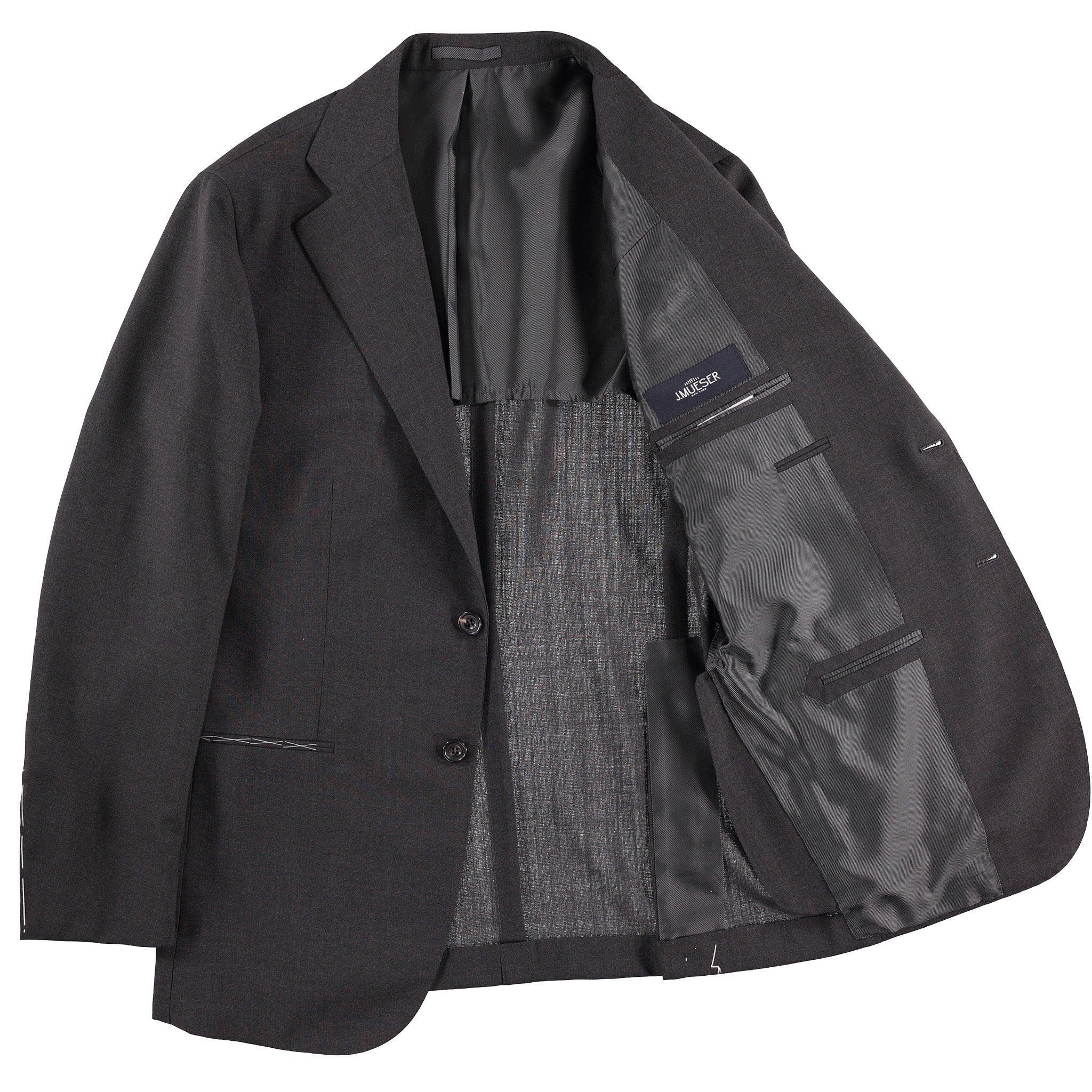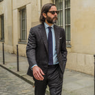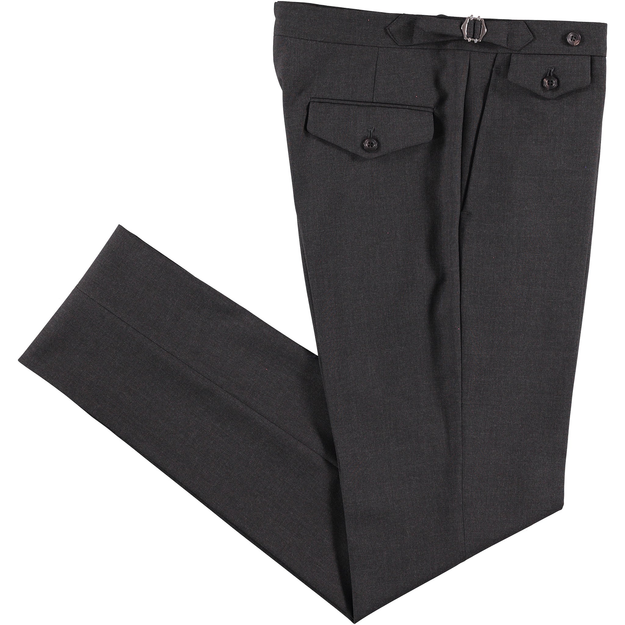 A deep charcoal fresco suit from our Waverly line- handcut and handmade at our sartoria in Naples, Italy. The hard-wearing fresco is a great four season addition to any wardrobe. The jacket is conservatively styled, with a two button front and simple jetted pockets, for a parred down look. The trousers sit high on the waist- with tab adjusters, a flap coin pocket, a jetted back left pocket, and a flap back right pocket.