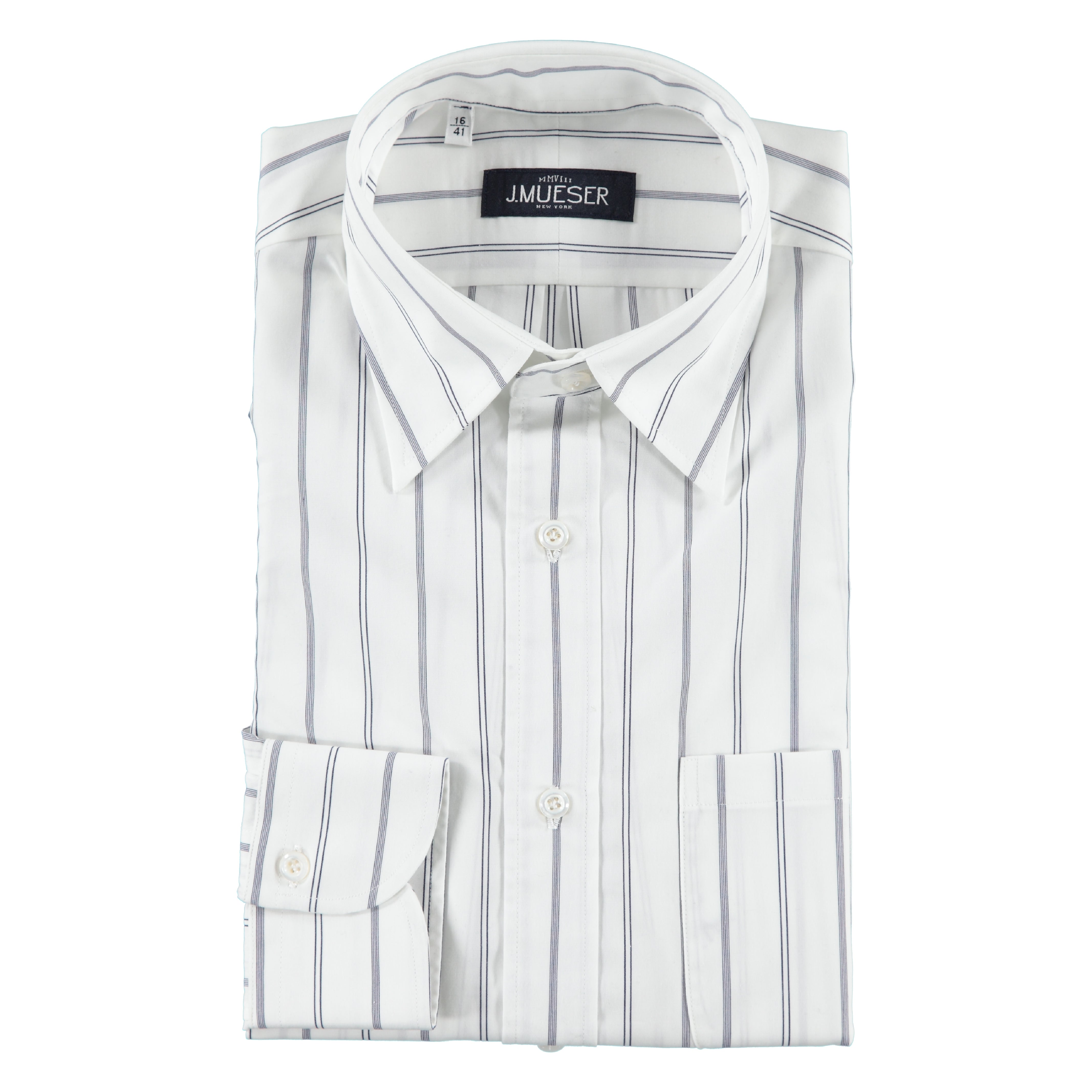A long point collar shirt in a white and navy multi stripe cotton poplin.