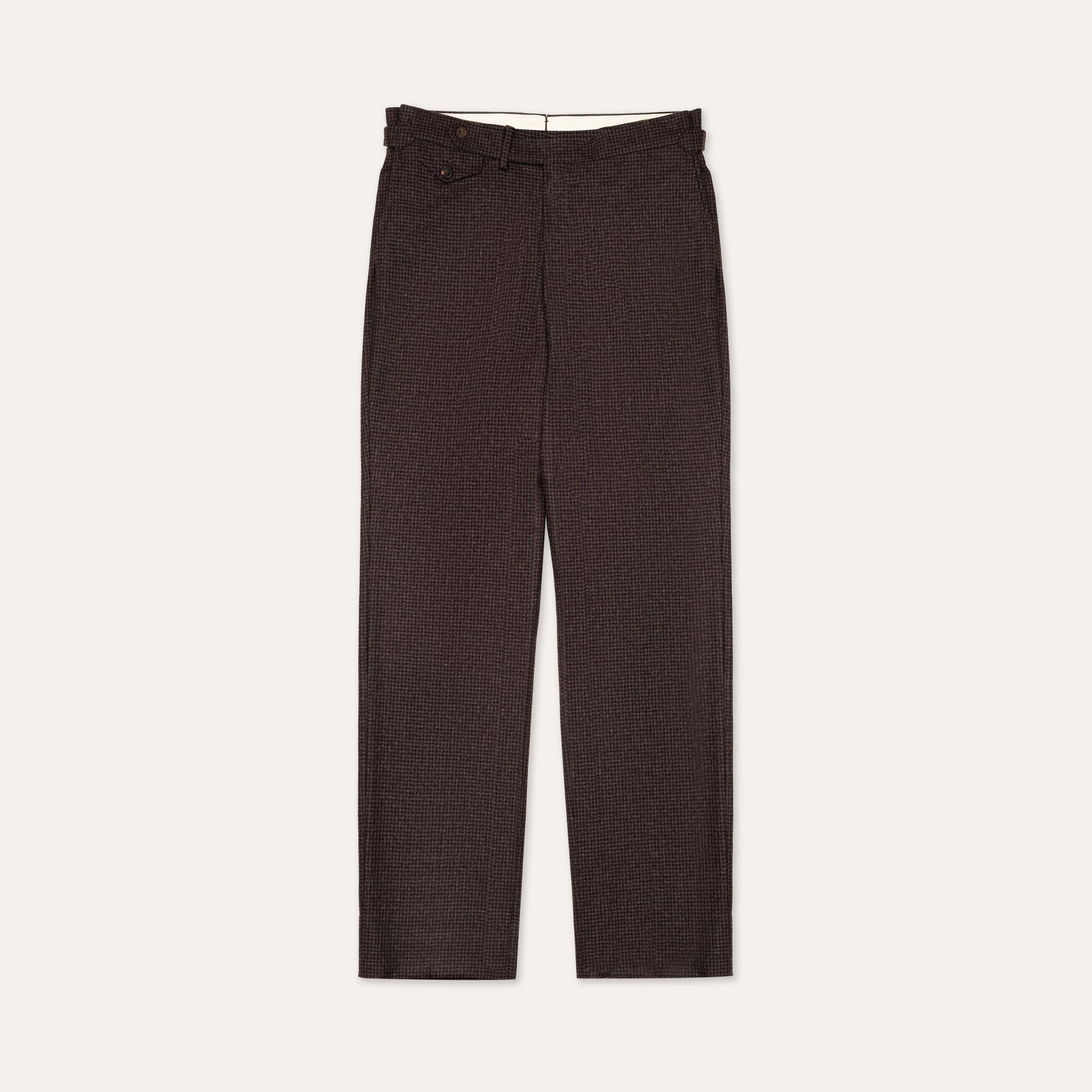 Our Waverly Suit, cut from a dark brown puppytooth wool flannel, is the perfect suit to take you wherever you may need to go. The Waverly Suit features a 3-roll-2 jacket with jetted hip pockets, barchetta chest pocket, hand sewn buttonholes, unpolished horn buttons, full canvas construction, and hand finishing. The trouser features a single pleat and belt loops along with a flap coin pocket, back left flap with button pocket, back right double welt with button pocket, and hand finishing.