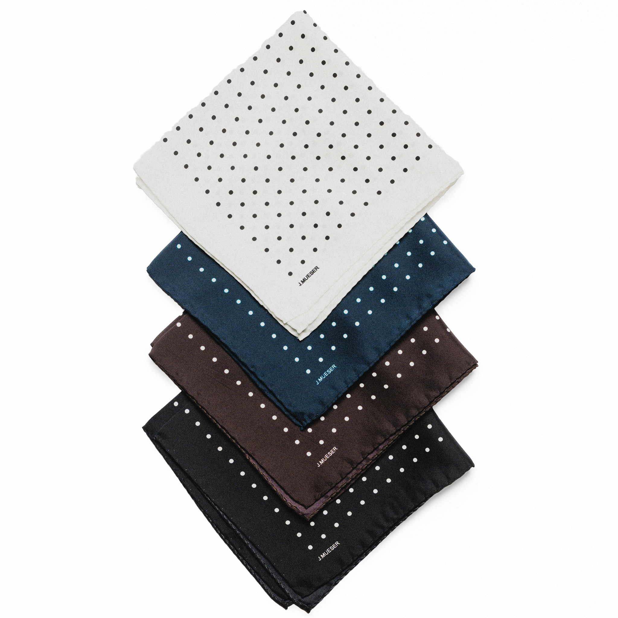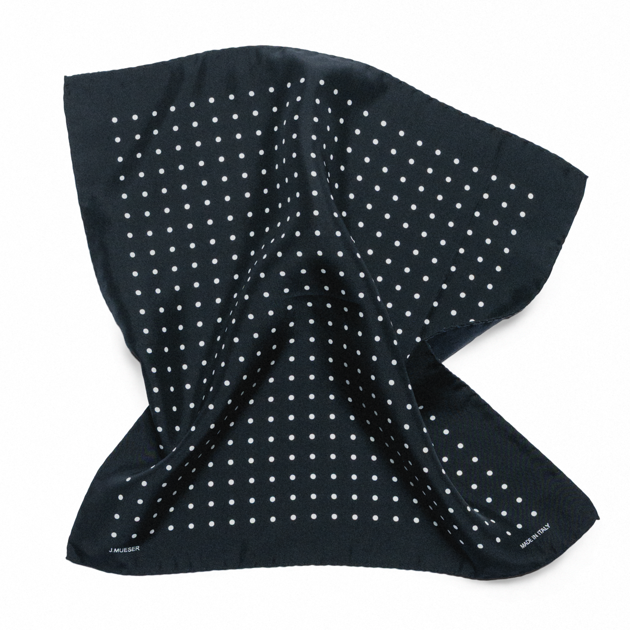 Made exclusively for J. Mueser on the shores of Lake Como, these pocket squares are cut from sandwashed silk with a classic pindot print.