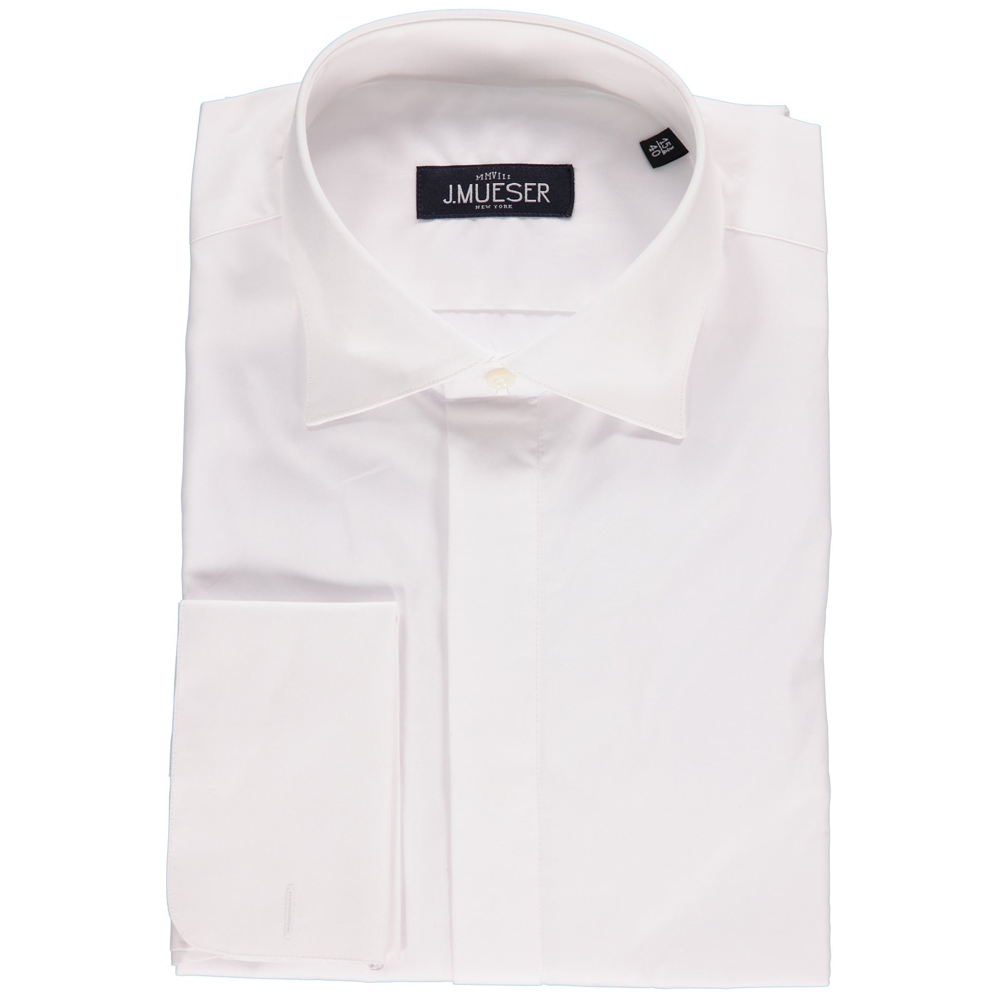 A classic tuxedo shirt with french cuffs and a covered placket.